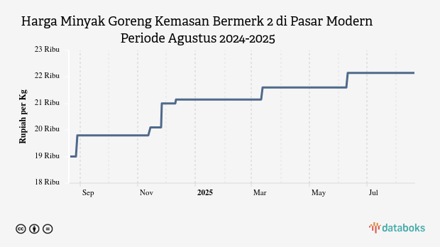Adapun terhadap harga sebulan terakhir, perkembangan harga minyak goreng kemasan bermerk 2 harian di pasar modern tidak mengalami perubahan dari sebelumnya yang tercatat sebesar Rp22,15 ribu per kg.