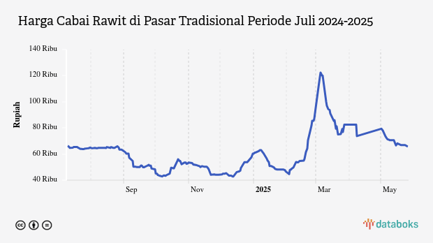 Adapun terhadap harga 30 hari lalu, perkembangan harga cabai rawit harian di pasar tradisional mengalami penurunan dari sebelumnya yang tercatat sebesar Rp75 ribu .