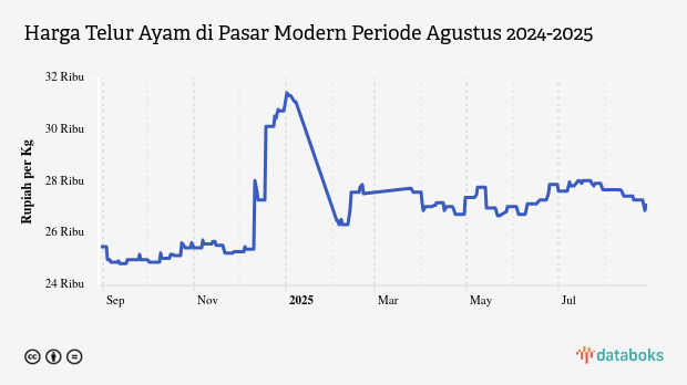 Adapun terhadap harga 30 hari lalu, perkembangan harga telur ayam harian di pasar modern mengalami penurunan dari sebelumnya yang tercatat sebesar Rp28,05 ribu per kg.