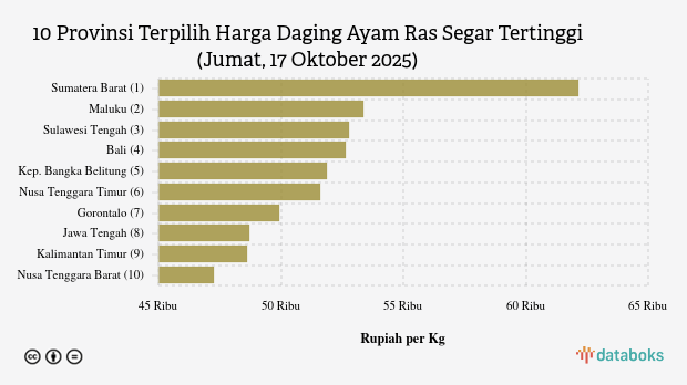 Harga daging ayam ras segar harian di pasar modern Sumatera Barat menjadi yang termahal se-Indonesia dengan harga jual Rp.62.150 per kg. Dibandingkan sebulan lalu, harga daging ayam ras segar di provinsi ini tidak mengalami perubahan. Harga jual tertinggi yang pernah dicatat di wilayah ini adalah Rp.70.000 per kg.
