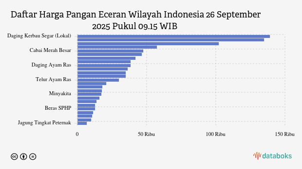 Melansir data panel harga pangan Badan Pangan Nasional (Bapanas) pada Jumat (26/9/2025) pukul 09.15 WIB, dari 25 komoditas terdapat 3 komoditas naik dan 22 komoditas turun.