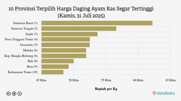 Harga daging ayam ras segar harian di pasar modern Sumatera Barat menjadi yang termahal se-Indonesia dengan harga jual Rp.62.150 per kg. Dibandingkan sebulan lalu, harga daging ayam ras segar di provinsi ini tidak mengalami perubahan. Harga jual tertinggi yang pernah dicatat di wilayah ini adalah Rp.70.000 per kg.