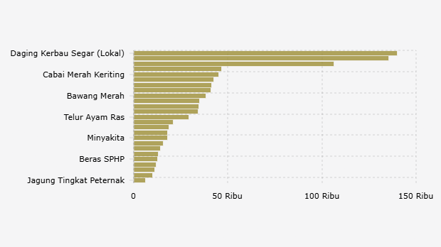 Sementara, harga beberapa komoditas seperti gula konsumsi, beras sphp, jagung tingkat peternak, tepung terigu kemasan, dan tepung terigu (curah) menurun dibanding harga kemarin.