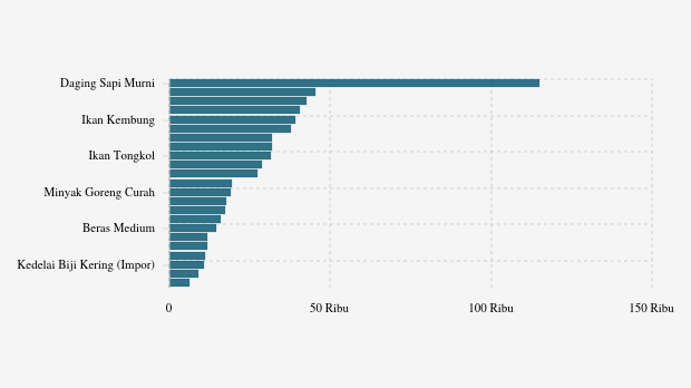 Komoditas ikan bandeng melonjak paling tinggi Rp778 (2,1%) menjadi Rp37.778 per kg. Adapun harga cabai merah keriting turun paling dalam Rp2.808 (6,17%) menjadi Rp42.692 per kg.