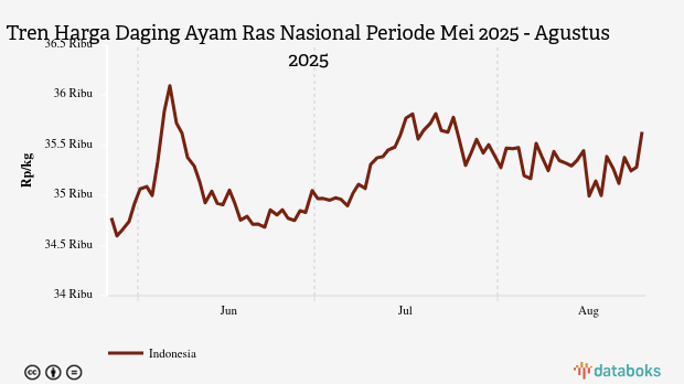 Selama periode Mei 2025 - Agustus 2025, rata-rata harga daging ayam terendah Rp34.597 per kg pada Rabu, 28 Mei 2025. Adapun harga tertinggi mencapai Rp36.096 per kg pada Jumat, 6 Juni 2025.