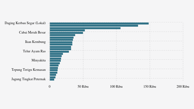 - Daging Kerbau Segar (Lokal): Rp148.333 per kg (naik 2,74%)