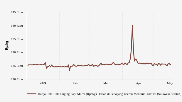 Sementara dilihat dari tren harga 3 bulan terakhir, rata-rata harga daging sapi di wilayah Sulawesi Selatan naik Rp610 (0,49%).