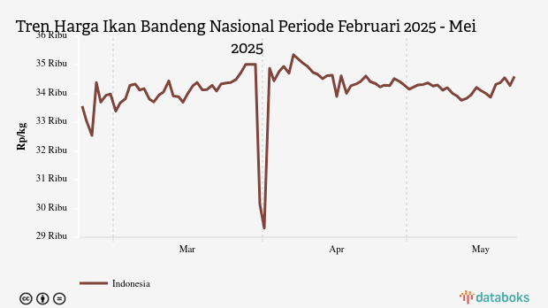 Selama periode Februari 2025 - Mei 2025, rata-rata harga ikan bandeng terendah Rp33.286 per kg pada Minggu, 23 Februari 2025. Adapun harga tertinggi mencapai Rp35.360 per kg pada Senin, 7 April 2025.