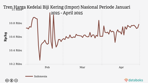 Selama periode Januari 2025 - April 2025, rata-rata harga kedelai biji kering impor terendah Rp10.377 per kg pada Sabtu, 1 Februari 2025. Adapun harga tertinggi mencapai Rp10.790 per kg pada Rabu, 30 April 2025.