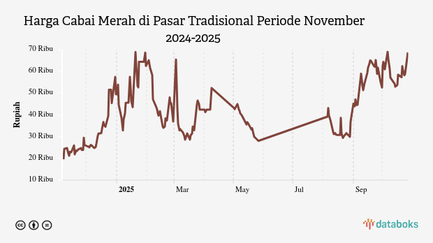 Adapun terhadap harga sebulan terakhir, perkembangan harga cabai merah harian di pasar tradisional mengalami kenaikan dari sebelumnya yang tercatat sebesar Rp59,4 ribu .