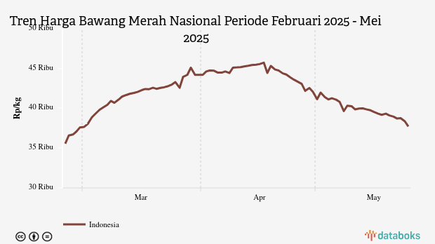 Selama periode Februari 2025 - Mei 2025, rata-rata harga bawang merah terendah Rp35.619 per kg pada Minggu, 23 Februari 2025. Adapun harga tertinggi mencapai Rp45.742 per kg pada Kamis, 17 April 2025.