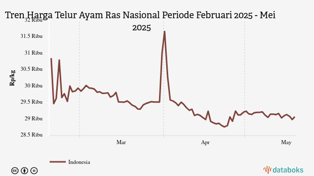 Selama periode Februari 2025 - Mei 2025, rata-rata harga telur ayam terendah Rp28.764 per kg pada Rabu, 23 April 2025. Adapun harga tertinggi mencapai Rp30.242 per kg pada Rabu, 2 April 2025.
