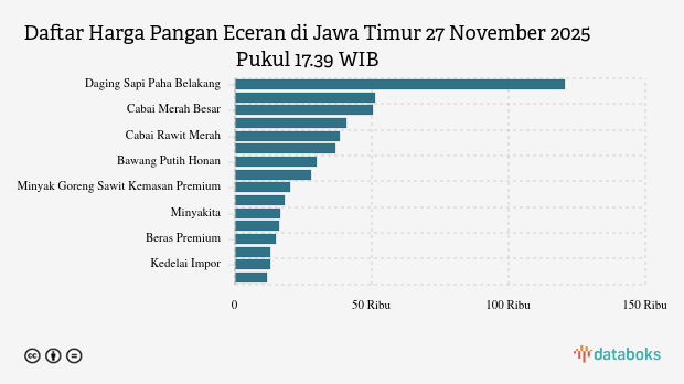 Berikut daftar lengkap harga 16 bahan pangan di Jawa Timur menurut SP2KP Kemendag 27 November 2025 pukul 17.39 WIB.
