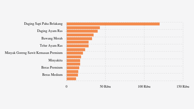 Komoditas cabai rawit merah melonjak paling tinggi Rp2.840 (7,52%) menjadi Rp40.620 per kg. Adapun harga ikan tongkol turun paling tajam Rp240 (0,83%) menjadi Rp28.530 per kg.