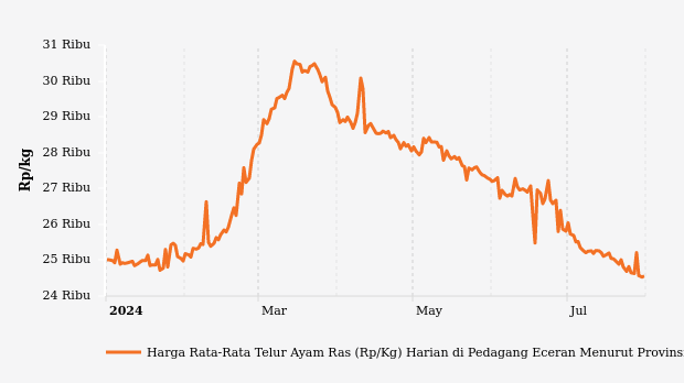 Sepanjang 2024, rata-rata harga telur ayam terendah Rp24.530 per kg pada Selasa, 30 Juli 2024. Adapun harga tertinggi mencapai Rp30.550 per kg pada Jumat, 15 Maret 2024.