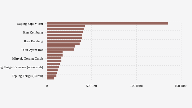 Komoditas yang naik harga yakni daging ayam ras, daging sapi murni, gula konsumsi, tepung terigu kemasan (non-curah), dan minyak goreng kemasan sederhana.