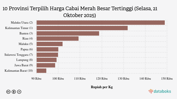 Kemudian di urutan ketiga, harga cabai merah besar di Banten seharga Rp.118,15 ribu per kg, Riau Rp.109,25 ribu per kg, dan Maluku Rp.101,9 ribu per kg.