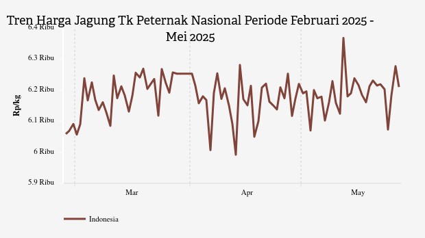 Selama periode Februari 2025 - Mei 2025, rata-rata harga jagung terendah Rp6.050 per kg pada Jumat, 18 April 2025. Adapun harga tertinggi mencapai Rp6.368 per kg pada Senin, 12 Mei 2025.