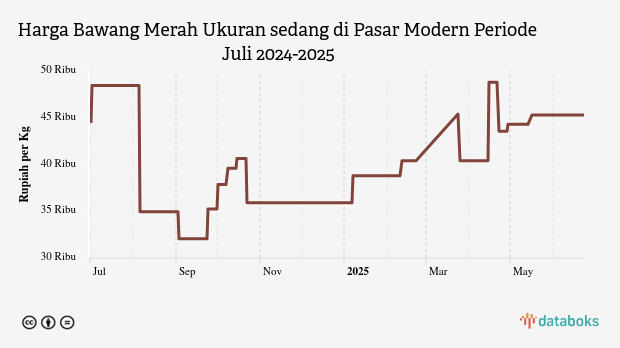 Adapun terhadap harga 30 hari lalu, perkembangan harga bawang merah ukuran sedang harian di pasar modern mengalami kenaikan dari sebelumnya yang tercatat sebesar Rp44,3 ribu per kg.