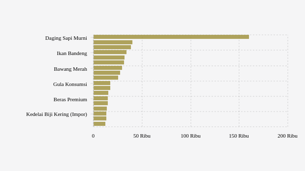 - Daging Sapi Murni: Rp160.000 per kg (naik 3,17%)