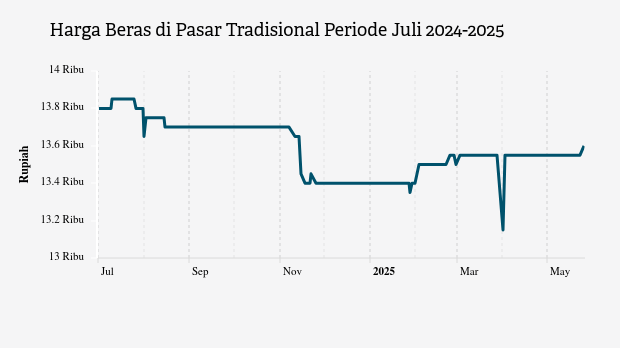 Adapun terhadap harga 30 hari lalu, perkembangan harga beras di pasar tradisional mengalami kenaikan dari sebelumnya yang tercatat sebesar Rp13,55 ribu .