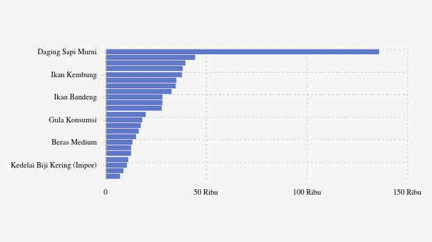 Komoditas cabai rawit merah melonjak paling tinggi Rp836 (2,16%) menjadi Rp39.548 per kg. Adapun harga bawang merah turun paling dalam Rp755 (1,68%) menjadi Rp44.290 per kg.