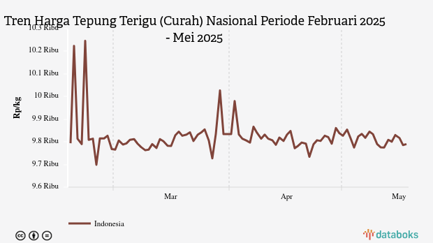 Selama periode Februari 2025 - Mei 2025, rata-rata harga tepung terigu curah terendah Rp9.759 per kg pada Minggu, 23 Februari 2025. Adapun harga tertinggi mencapai Rp9.980 per kg pada Rabu, 2 April 2025.