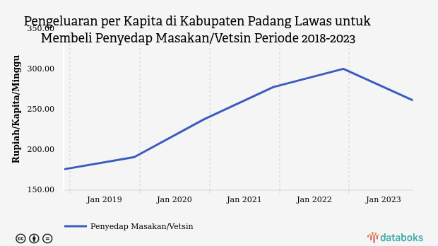 Rata-rata pengeluaran masyarakat di Kabupaten Padang Lawas untuk membeli penyedap masakan/vetsin pada 2023 adalah Rp261.38 per kapita per minggu. Nilai ini turun dibandingkan dengan pengeluaran tahun sebelumnya yang tercatat Rp300.51 per kapita per minggu.