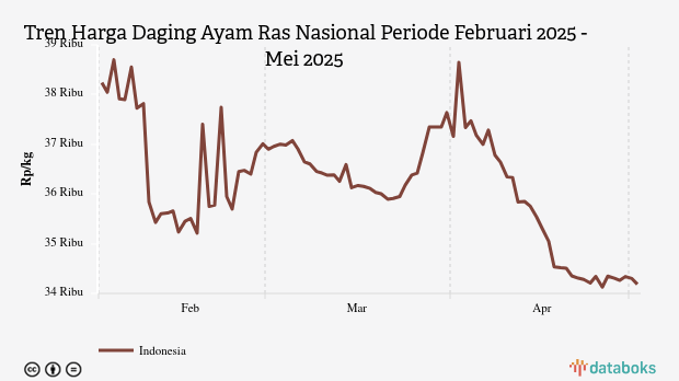 Selama periode Februari 2025 - Mei 2025, rata-rata harga daging ayam terendah Rp34.184 per kg pada Jumat, 2 Mei 2025. Adapun harga tertinggi mencapai Rp38.537 per kg pada Rabu, 2 April 2025.