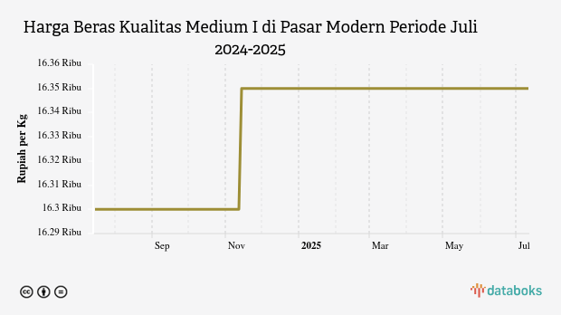 Adapun terhadap harga 30 hari lalu, perkembangan harga beras kualitas medium I harian di pasar modern tidak mengalami perubahan dari sebelumnya yang tercatat sebesar Rp16,35 ribu per kg.