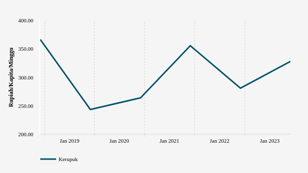 Pengeluaran masyarakat untuk membeli kerupuk di kabupaten Mamuju Utara pada 2023 adalah Rp328.13 per kapita per minggu. Nilai ini melambung dibandingkan dengan pengeluaran tahun sebelumnya yang tercatat Rp280.86 per kapita per minggu.