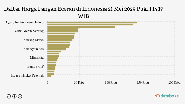 Melansir data panel harga pangan Badan Pangan Nasional (Bapanas) pada Rabu (21/5/2025) pukul 14.17 WIB, dari 25 komoditas terdapat 12 komoditas naik dan 13 komoditas turun.