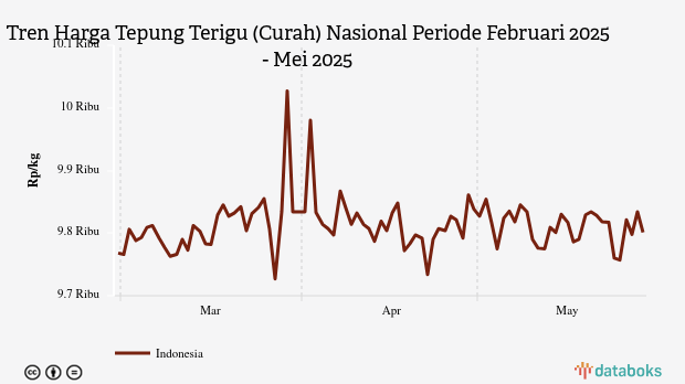 Selama periode Februari 2025 - Mei 2025, rata-rata harga tepung terigu curah terendah Rp9.757 per kg pada Minggu, 25 Mei 2025. Adapun harga tertinggi mencapai Rp9.980 per kg pada Rabu, 2 April 2025.