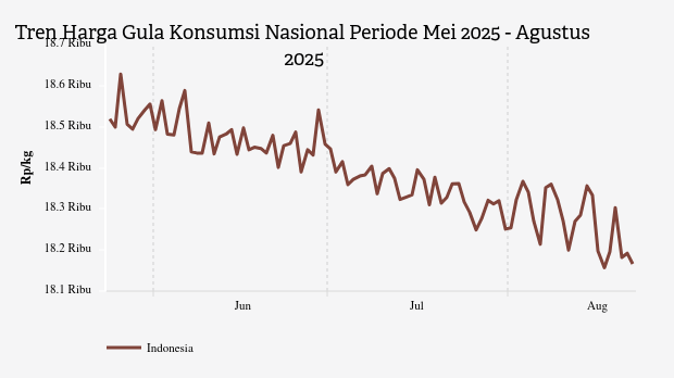 Selama periode Mei 2025 - Agustus 2025, rata-rata harga gula terendah Rp18.157 per kg pada Minggu, 17 Agustus 2025. Adapun harga tertinggi mencapai Rp18.628 per kg pada Senin, 26 Mei 2025.