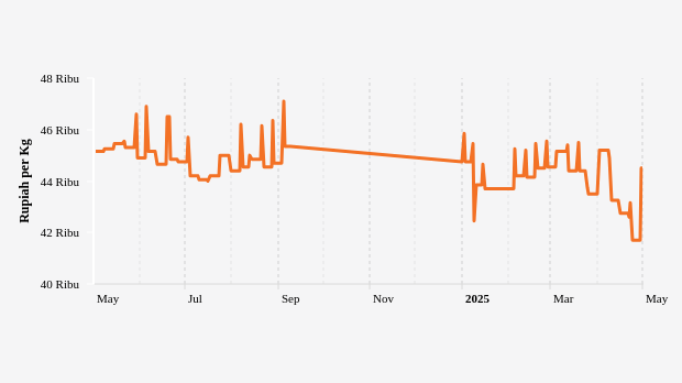 5. Daging Ayam per Kg Rp44,5 ribu per kg (naik 0.23%)