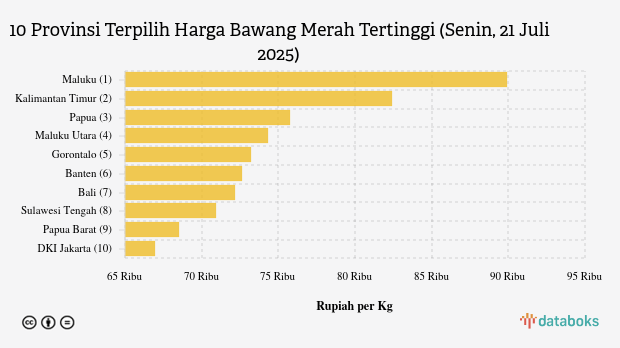 Harga bawang merah harian di pasar modern Maluku menjadi yang termahal se-Indonesia dengan harga jual Rp.89.900 per kg. Dibandingkan sebulan lalu, harga bawang merah di provinsi ini tidak mengalami perubahan. Harga jual tertinggi yang pernah dicatat di wilayah ini adalah Rp.94.450 per kg.