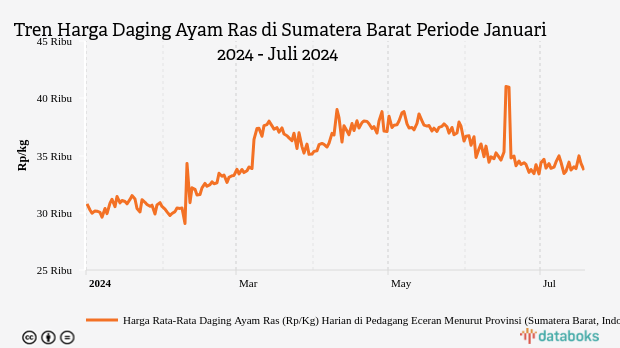 Berdasarkan data harga pangan eceran Badan Pangan Nasional (Bapanas) pada Kamis (18/7/2024) pukul 15.40 WIB, harga daging ayam di Sumatera Barat mencapai Rp33.710 per kg.