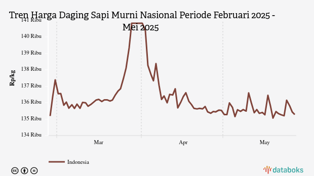 Selama periode Februari 2025 - Mei 2025, rata-rata harga daging sapi terendah Rp134.680 per kg pada Selasa, 25 Februari 2025. Adapun harga tertinggi mencapai Rp140.843 per kg pada Jumat, 28 Maret 2025.