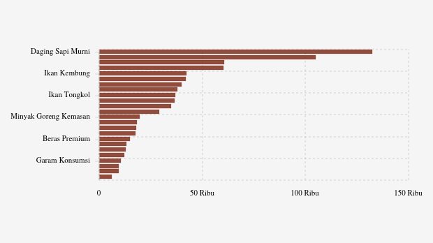 Komoditas tepung terigu kemasan naik paling tinggi Rp221 (1,76%) menjadi Rp12.774 per kg. Adapun harga cabai merah keriting turun paling dalam Rp1.901 (3,05%) menjadi Rp60.325 per kg.