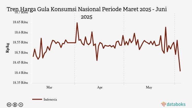 Selama periode Maret 2025 - Juni 2025, rata-rata harga gula terendah Rp18.409 per kg pada Rabu, 4 Juni 2025. Adapun harga tertinggi mencapai Rp18.650 per kg pada Rabu, 2 April 2025.