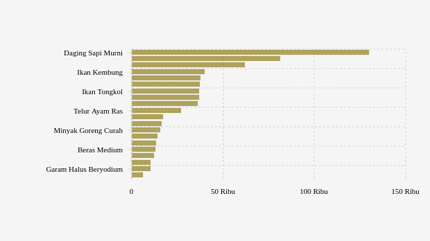 Komoditas daging ayam ras naik paling tinggi Rp2.640 (7,64%) menjadi Rp37.190 per kg. Adapun harga minyak goreng kemasan sederhana turun paling rendah Rp1.220 (6,98%) menjadi Rp16.250 per liter.