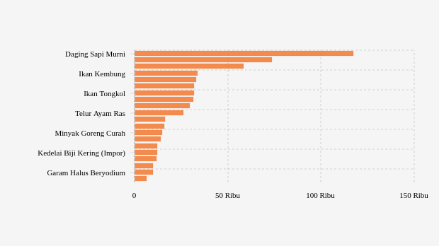 Komoditas bawang merah melonjak paling tinggi Rp560 (1,92%) menjadi Rp29.660 per kg. Adapun harga ikan bandeng turun paling rendah Rp1.810 (5,41%) menjadi Rp31.660 per kg.