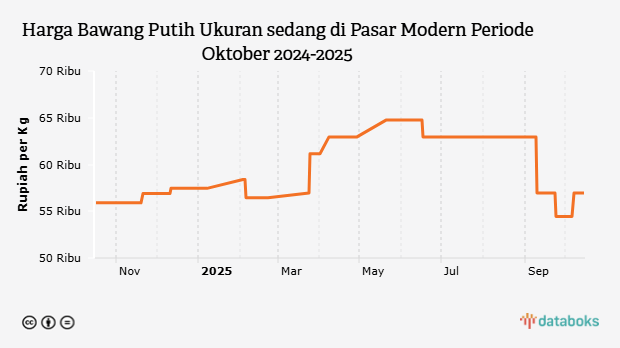 Sedangkan harga bawang putih ukuran sedang harian di pasar modern dalam tiga bulan terakhir di DKI Jakarta terlihat turun 12.05%. Menurut catatan historis harga pangan di panel harga PIHPS, harga bawang putih ukuran sedang harian di pasar modern provinsi DKI Jakarta diperdagangkan di harga Rp64,75 ribu per kg.