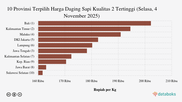 10 Provinsi dengan Harga Daging Sapi Kualitas 2 Paling Mahal (Selasa, 4 November 2025)