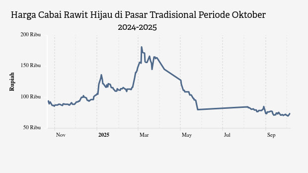 Adapun terhadap harga sebulan terakhir, perkembangan harga cabai rawit hijau harian di pasar tradisional mengalami penurunan dari sebelumnya yang tercatat sebesar Rp78,75 ribu .