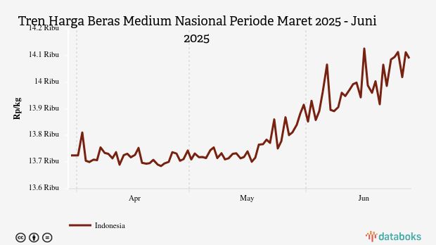 Selama periode Maret 2025 - Juni 2025, rata-rata harga beras medium terendah Rp13.685 per kg pada Rabu, 23 April 2025. Adapun harga tertinggi mencapai Rp14.126 per kg pada Senin, 16 Juni 2025.