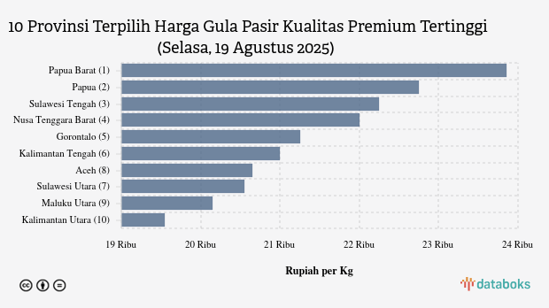 Harga gula pasir kualitas premium harian di pasar modern Papua Barat menjadi yang termahal se-Indonesia dengan harga jual Rp.23.850 per kg. Dibandingkan sebulan lalu, harga gula pasir kualitas premium di provinsi ini lebih rendah. Sebelumnya tercatat pada angka 24.100 per kg.