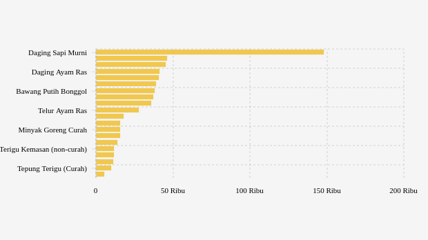- Daging Sapi Murni: Rp148.080 per kg (naik 3,47%)