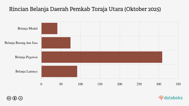 Selama periode Januari 2025 hingga Oktober 2025, realisasi Belanja Daerah Pemkab Toraja Utara sebesar Rp514,26 miliar atau setara 45,11% dari anggaran Belanja Daerah 2025.