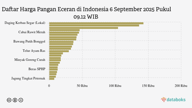 Berdasarkan data panel harga pangan Badan Pangan Nasional (Bapanas) pada Sabtu (6/9/2025) pukul 09.12 WIB, dari 25 komoditas terdapat 8 komoditas naik dan 17 komoditas turun.
